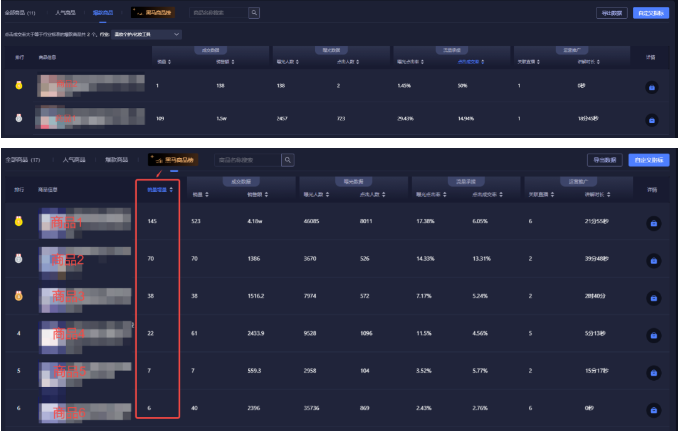 比如下面这个直播间,爆款商品是商品2,但黑马商品榜排行第一的是商品1,那就说明商品2是当前直播间的潜力爆款,可以适当增加讲解频次,促成新的成交和转化。